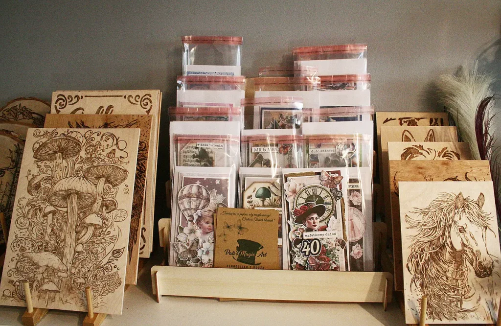 Kartki okolicznościowe, makramy, serwetki, łapacze snów, drewniane dekoracje i magnesy wypalane pirografem.